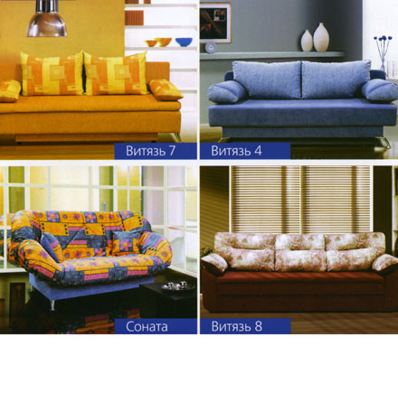 — Механизм трансформации «еврокнижка»; — Спальное место 2050×1500 мм.; — Съемные чехлы подушек спинки сиденья; — Вместительный ламинированный короб для постельных принадлежностей; — Диван может комплектоваться накладным столиком на боковину и креслом, которое, по желанию, может изготавливаться с выдвигающимся ящиком. _________________________________________________________________________________________ «Витязь 7» — Механизм трансформации «еврокнижка»; — Габаритные размеры 1950×760×850 мм.; — Спальное место 1950×1400 мм.; — Съемные чехлы подушек; — Подушка сиденья перекидная, выполняет роль матраца при формировании спального места; — Диван имеет короб для постельных принадлежностей. «Витязь 4» — Механизм трансформации «еврокнижка»; — Габаритные размеры 1950×760×850 мм.; — Спальное место 1950×1400 мм.; — Съемные чехлы подушек; — Подушка сиденья перекидная, выполняет роль матраца при формировании спального места; — Основание спального места — пружинный блок. «Витязь 8» — Механизм трансформации «еврокнижка»; — Габаритные размеры 1950×760×850 мм.; — Спальное место 1950×1400 мм.; — Съемные чехлы подушек; — Подушка сиденья перекидная, выполняет роль матраца при формировании спального места; — Диван имеет короб для постельных принадлежностей. «Соната» — Механизм трансформации «финка-люкс»; — Габаритные размеры 2050×1050×100 мм.; — Спальное место 1950×1400 мм.; — Особенностью механизма трансформации является возможность трансформировать боковые части сиденья и спинки в подлокотники или в подголовники; — Есть вместительный короб для белья.