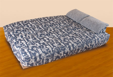 Габариты (ШхГхВ), мм: 1920х1000х1000. Спальное место, мм: 1920х1400. Каркас - металлокаркас с ортопедическими латами. Механизм трансформации - «Книжка» двухпозиционный. Спинка и сиденье - ортопедический матрас. Бельевой ящик - ламинированное ДСП и ДВП. Обивка - под заказ. Опоры - хром-металл. Чехол - съемный с наполнителем дюрафил, рисунок стежки по каталогу.