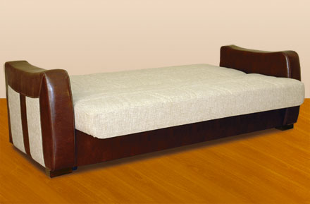 Габариты дивана (ШхГхВ), мм: 2320×930×1020. Спальное место, мм: 1930×1280. Габариты кресла (ШхГ), мм: 950×930. Каркас — хвойные породы древесины, многослойная березовая фанера. Механизм трансформации — «Книжка», на каждый день, легко раскладывается. Спинка и сиденье— основа пружинный блок, настил ППУ. Бельевой ящик — ламинированное ДСП, ламинированное ДВП. Съемные подлокотники — упрощают процесс транспортировки. Обивка — стеганный несъемный чехол с индивидуальным рисунком. Опоры — лакированные деревянные изделия.