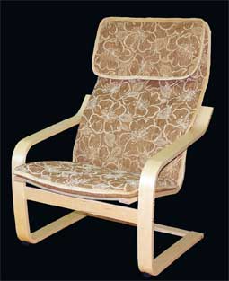 Габариты, мм: 830х680х1000. Каркас кресла – многослойный клееный каркас (буковый шпон, морилка, прозрачный акриловый лак), приятно пружинит. Высокая спинка обеспечивает хорошую опору для шеи. Выдерживает вес до 170 кг. Подушка-сиденье на кресло – съемный простеганный чехол с индивидуальным рисунком, основа ППУ.